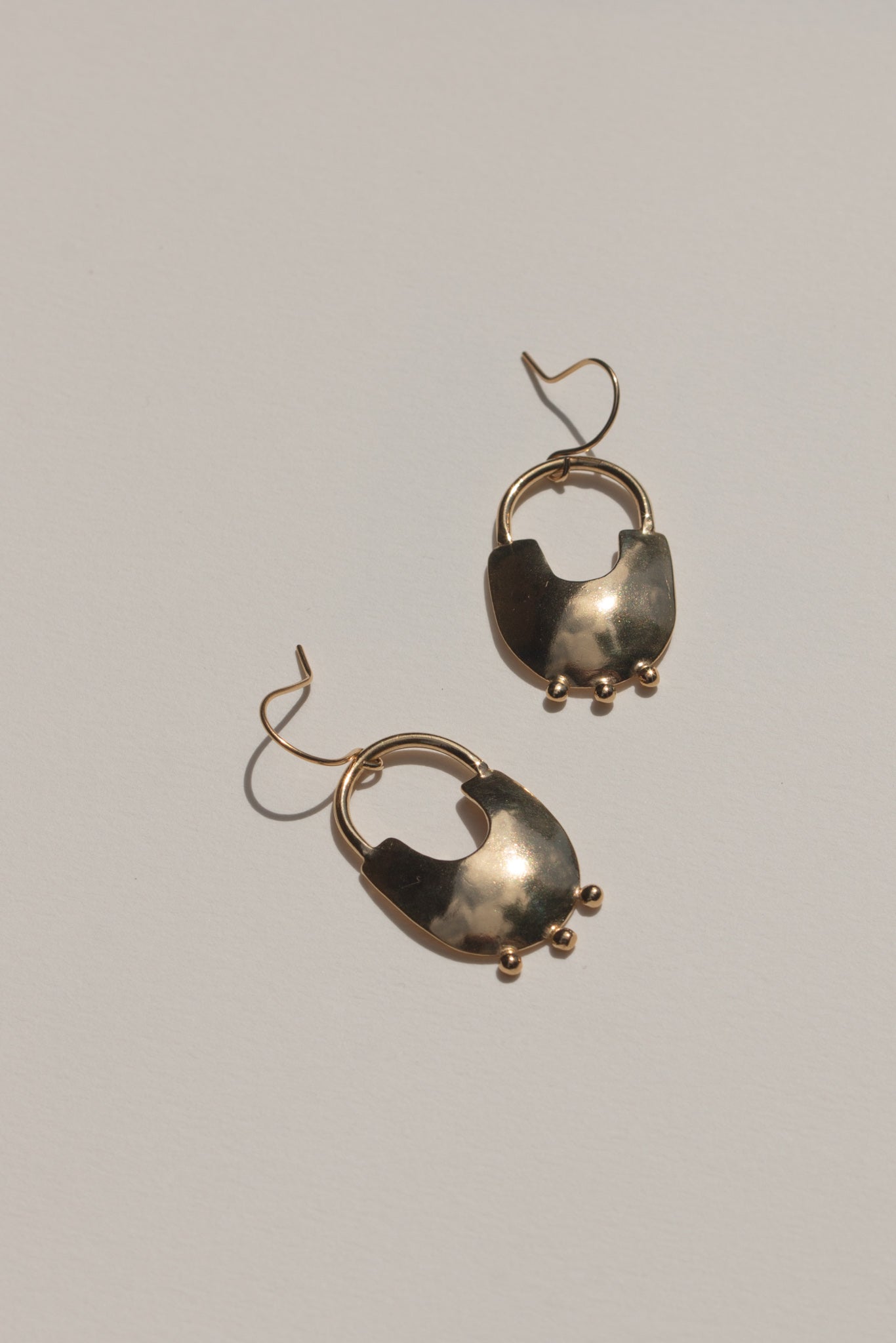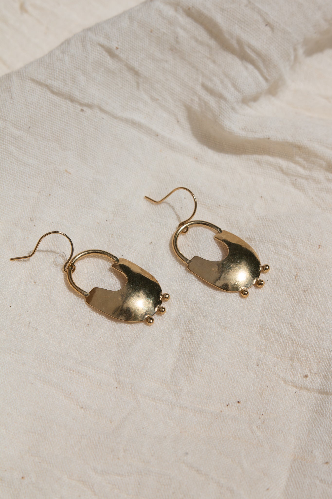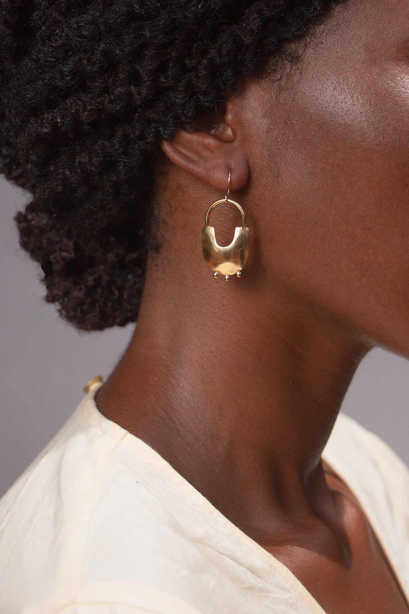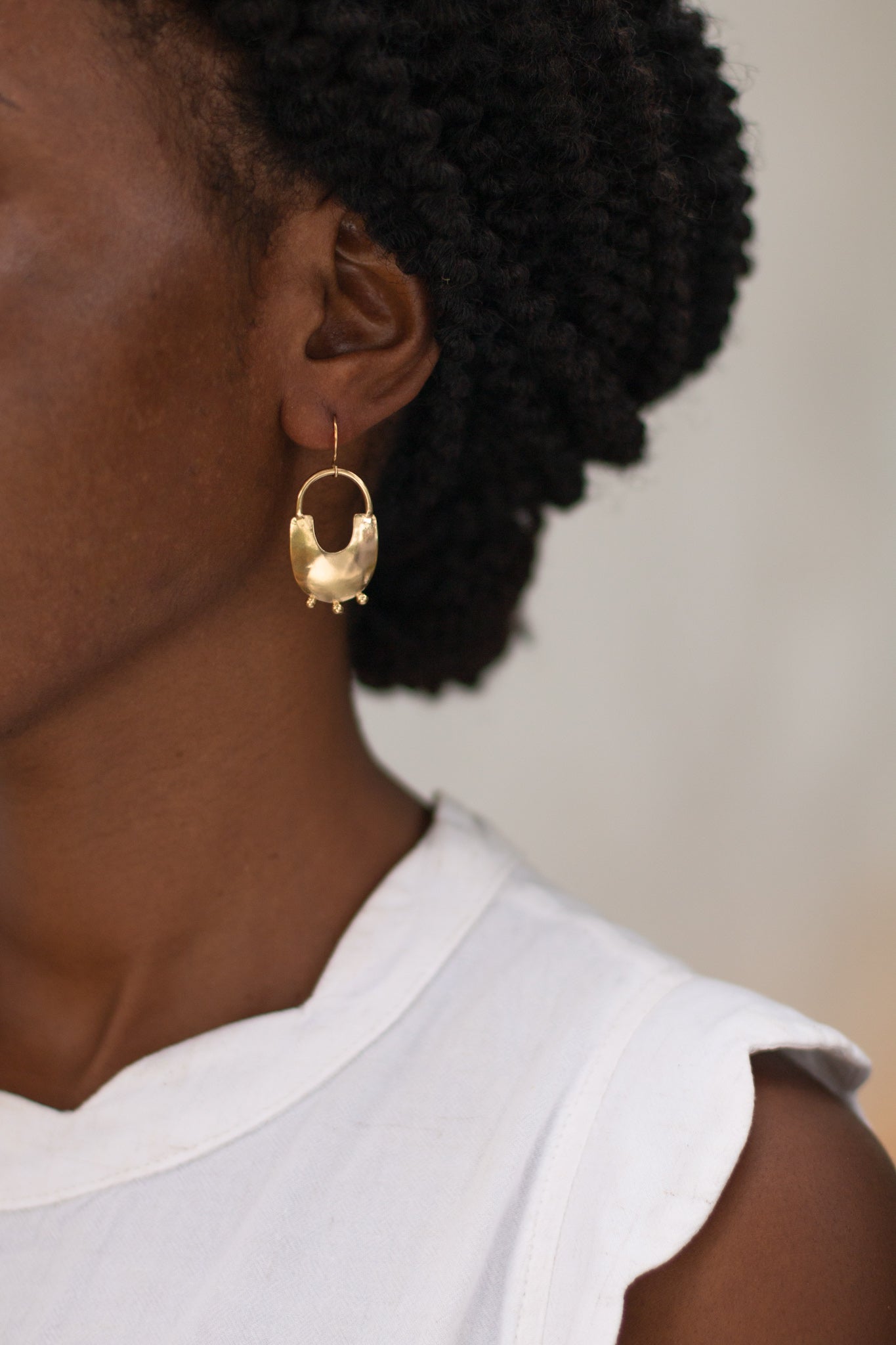 The 'Bamasha' Earrings (meaning 'To Hit' in Tumbuka) are crafted with exquisite attention to detail, designed to bring strength to your everyday, while 14k gold plating ensures a rich and long lasting finish. Each piece is individually hand-forged to achieve a slight domed shape to offer a playful sense of motion & dimension.