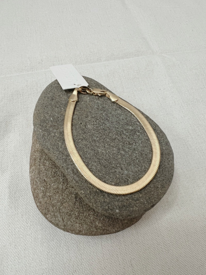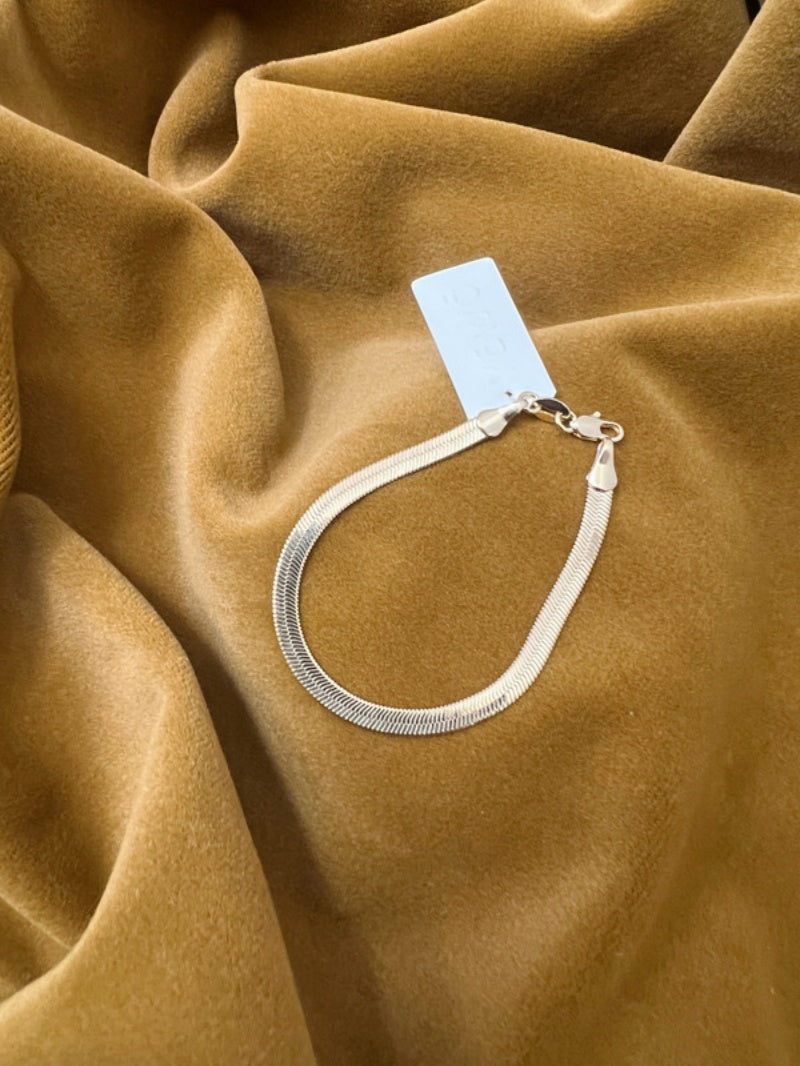 A herringbone bracelet that drapes with soft, fluid movement and catches the sun’s glow. Delicate yet striking, it reflects light with quiet ease — perfect worn alone or layered with other bracelets.